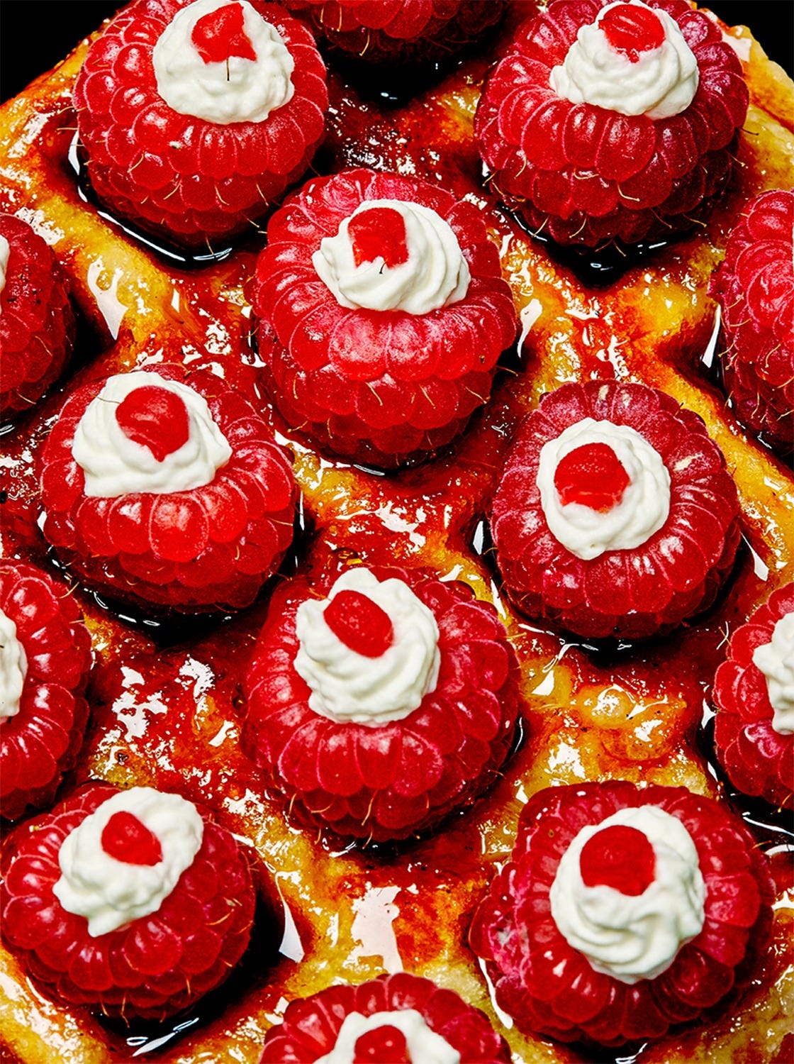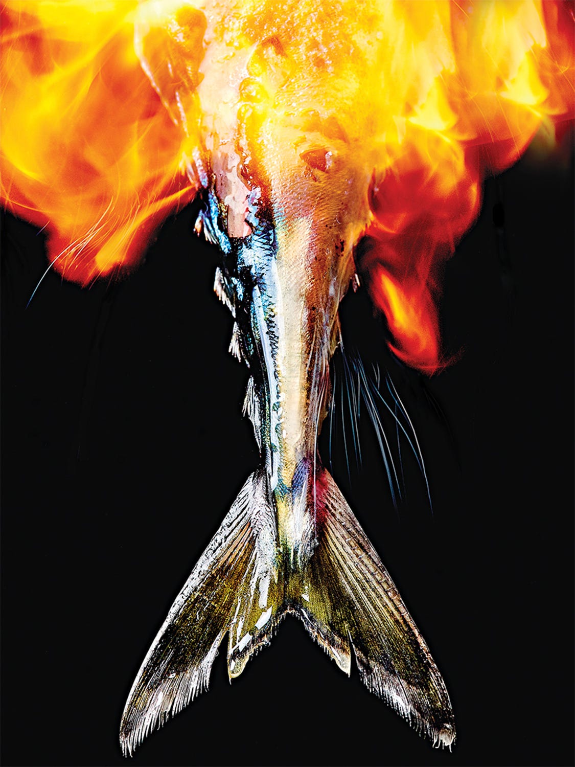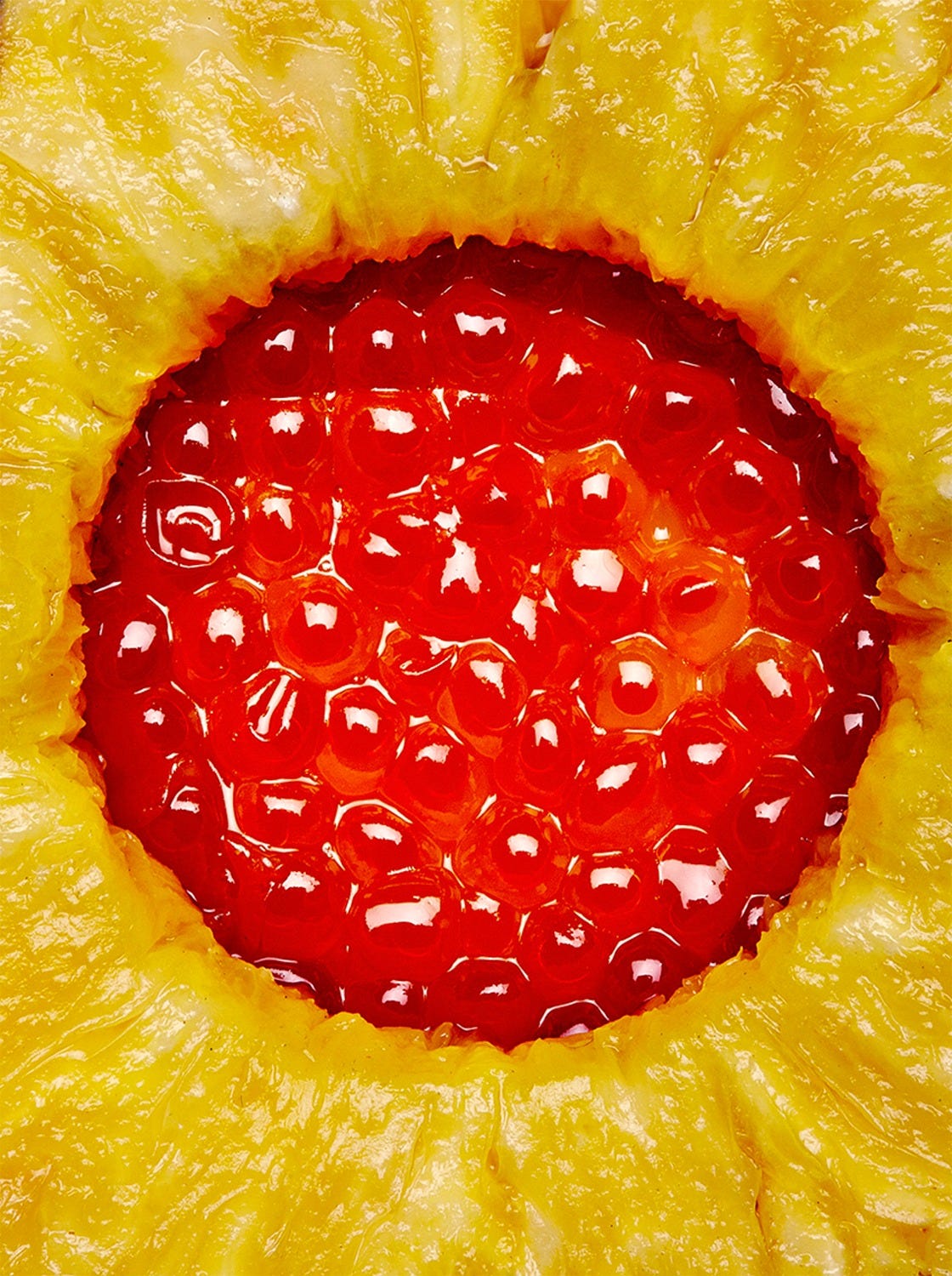 Jamie Kimm’s work is bold and surprising. I like the drama of a flaming fresh fish (last image, below), and especially enjoy how the glistening red orbs embedded in what looks like a pineapple slice resemble an alien wound (first image, below).