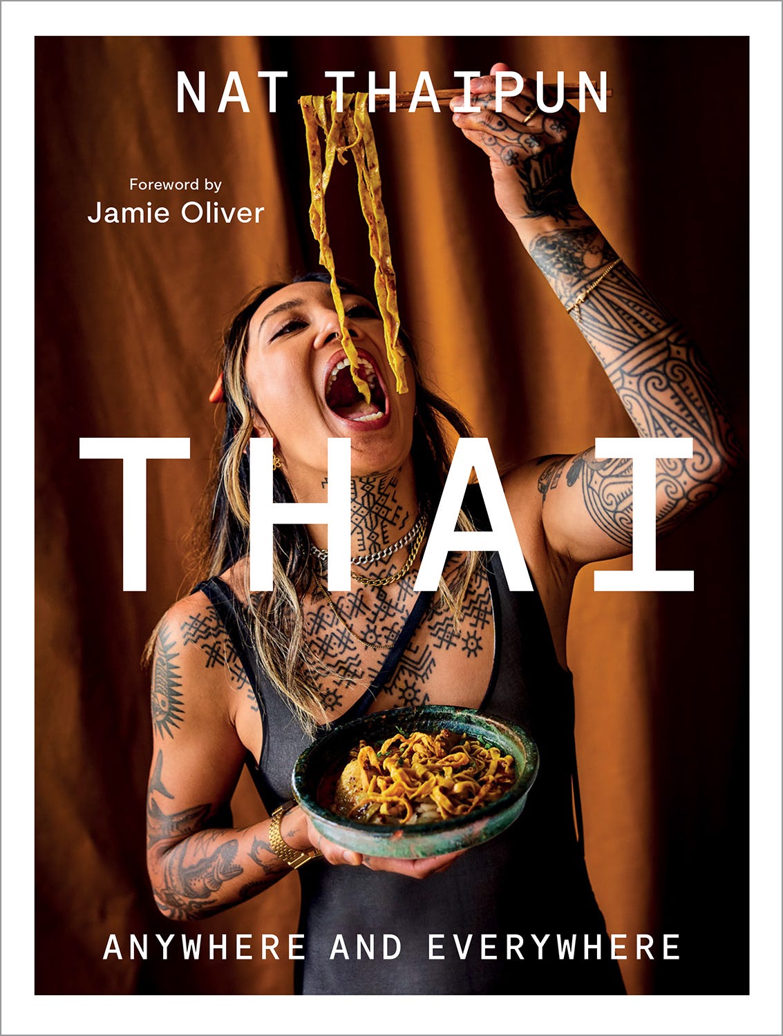 Thai’s tonality, typography, and framing are important cover design devices. They temper the boldness of Thaipun’s photograph and establish that, as commanding as she is, this book is not really about her, but about the simplicity and craveability6 of her food. Those gorgeous golden noodles—dangling tantalizingly in front of her—are Thai’s main attraction.